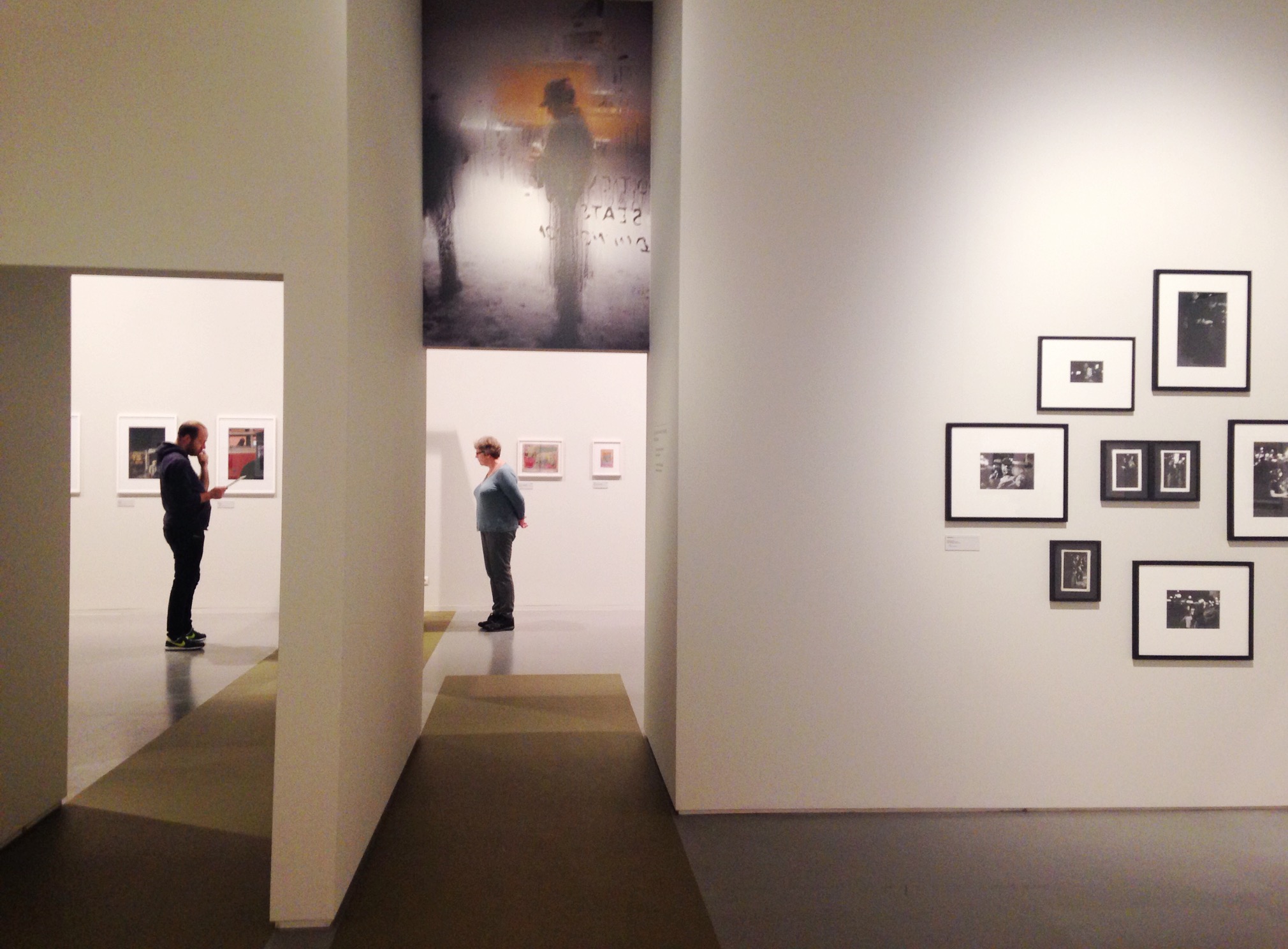 The works are alternatively installed in a linear way, with the framed images following each other in a sequence, or in clusters forming constellations that delineate a related group of images, as is the case with a series of black-and-white shots taken at Halloween and one depicting shoes.
