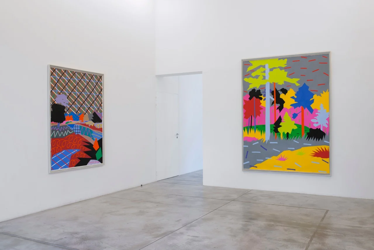 Les tableaux de la belge Leen Voet (née en 1971) et de l'écossaise Fiona MacKay (née en 1984) se situent quant à eux au confluent de l'abstraction et de la figuration. Les toiles vitaminées, à la fois graphiques et rigoureusement composées, de la première présentent des paysages et des scènes d'intérieur. La série de Leen Voet s'intitule Bert Vandael et revisite les travaux à l'aquarelle qu'elle a réalisé lors de ses études auprès d'un professeur du même nom. Elle morcèle les images qu'elle peint en moult couches de couleurs auxquelles elle ajoute des motifs circulaires ou en zigzags et des lignes striées ou hachurées. Les contours des formes géométriques qu'elle colorie sont stricts et les plages chromatiques "pop" et fluo se côtoient sans jamais se confondre. L'artiste cite volontiers Henri Matisse parmi ses sources d'inspiration et la saturation des couleurs rappelle la palette solaire et joyeuse des paysages californiens de David Hockney.