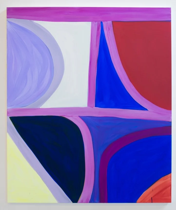 A l'apparent monochrome des oeuvres d'Amy Feldman succède la collision des blocs de couleurs de Marina Adams (née en 1960). Une vitalité éclatante et communicative sous-tend l'exubérance des toiles de cette peintre américaine. Demi-cercles, triangles et rectangles aux contours souples et arrondis s'emboitent les uns dans les autres à la manière de Sonia Delaunay (1885-1979). L'application rapide et intuitive de la peinture, translucide par endroits et opaque à d'autres, révèle en transparence des nuances chromatiques surprenantes et harmonieuses. Comme l'explique l'artiste: "à cet égard [le rythme de la peinture], je pense plutôt à la musique, étant donné qu'il y a un flux et un continuum."