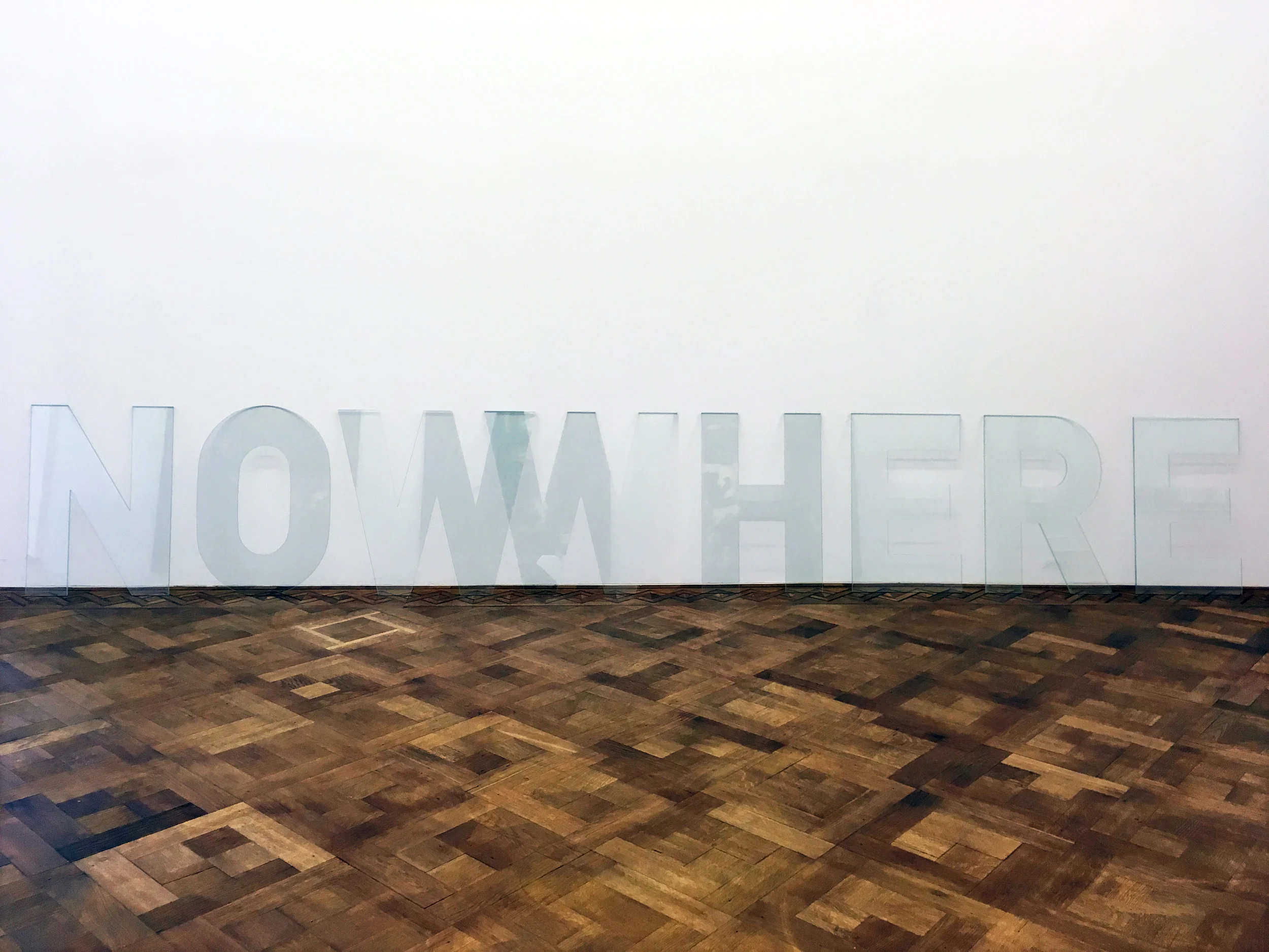 La logique est similaire dans Nowwhere (2016), une sculpture en verre posée à même le sol qui accole les mots "now" ("maintenant") et where ("où"). Ce mot hybride en cache un autre: "nowhere" qui signifie "nulle part". Les "w" des deux mots sont superposés, ce qui nous encourage à lire la sculpture transparente d'une traite. L'artiste déjoue ainsi les règles d'orthographe et questionne les notions de lieu et de temps...