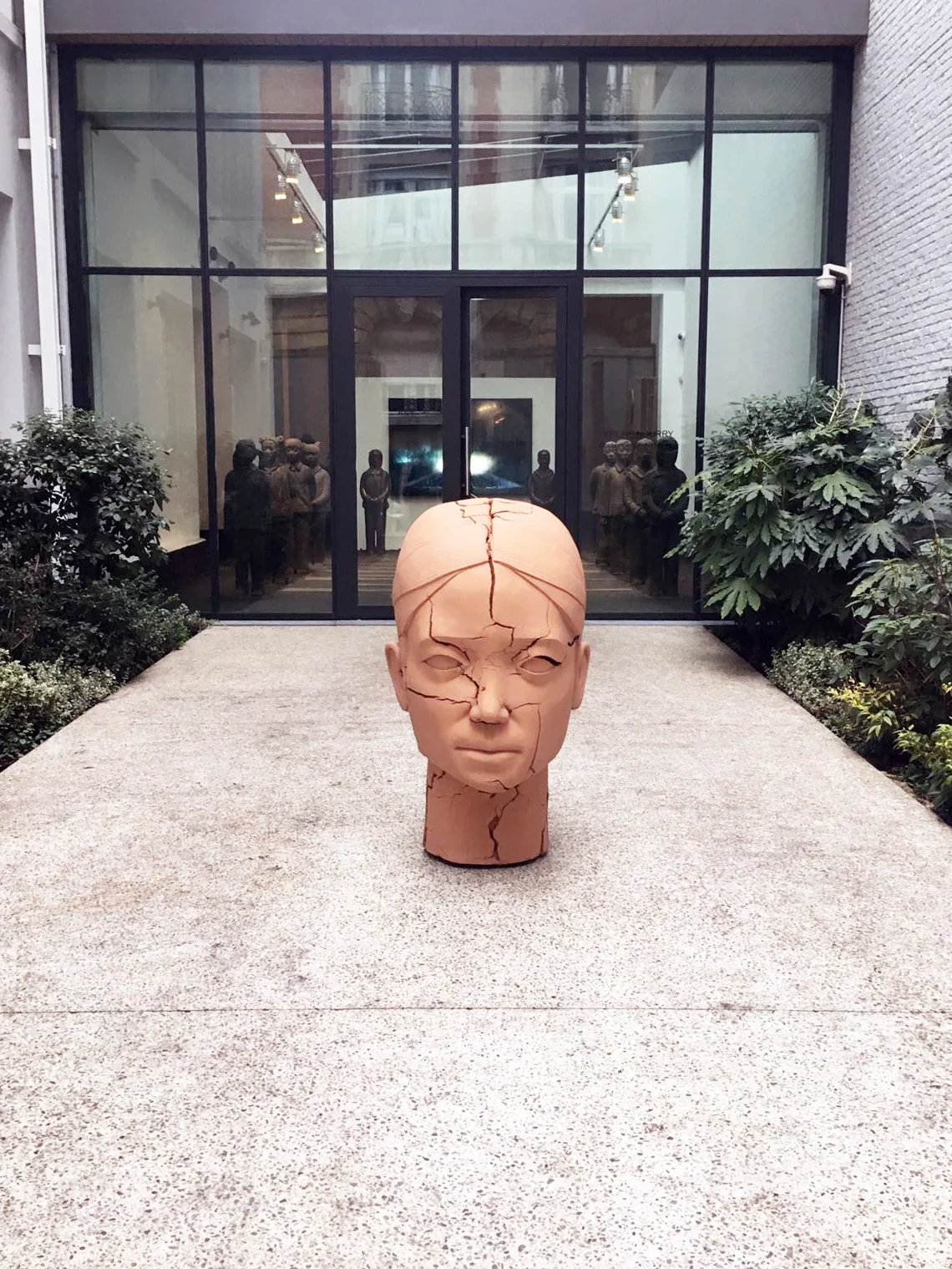 Dans la cour qui mène à la galerie, le visiteur est accueilli par un buste imposant. Il s'agit d'un visage sculpté dont la surface, fissurée de toutes parts, rappelle la fragilité et l'usure que le passage du temps et la force des éléments infligent à l'objet archéologique. Les craquelures du "crâne" exposé font penser au dessin d'une mappemonde sur un globe terrestre... D'emblée Prune Nourry brouille la frontière entre l'artéfact et l'oeuvre d'art, entre le passé et le présent, entre l'ancien et le contemporain...