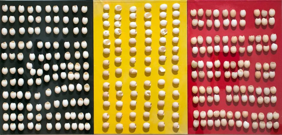 Dans Le Lion belge (1968), le félin de l’armoirie du royaume est "servi" dans une poêle et dans Sans Titre (triptyque) (1965-1966), le drapeau tricolore est recouvert de coquilles d’œufs vides par allusion à la vacuité de ce symbole patriotique par excellence.