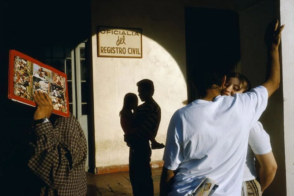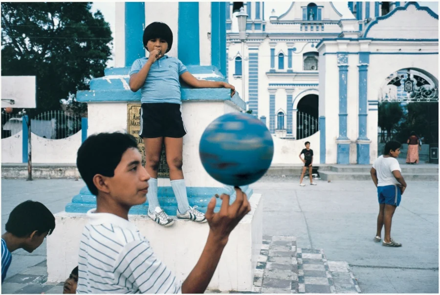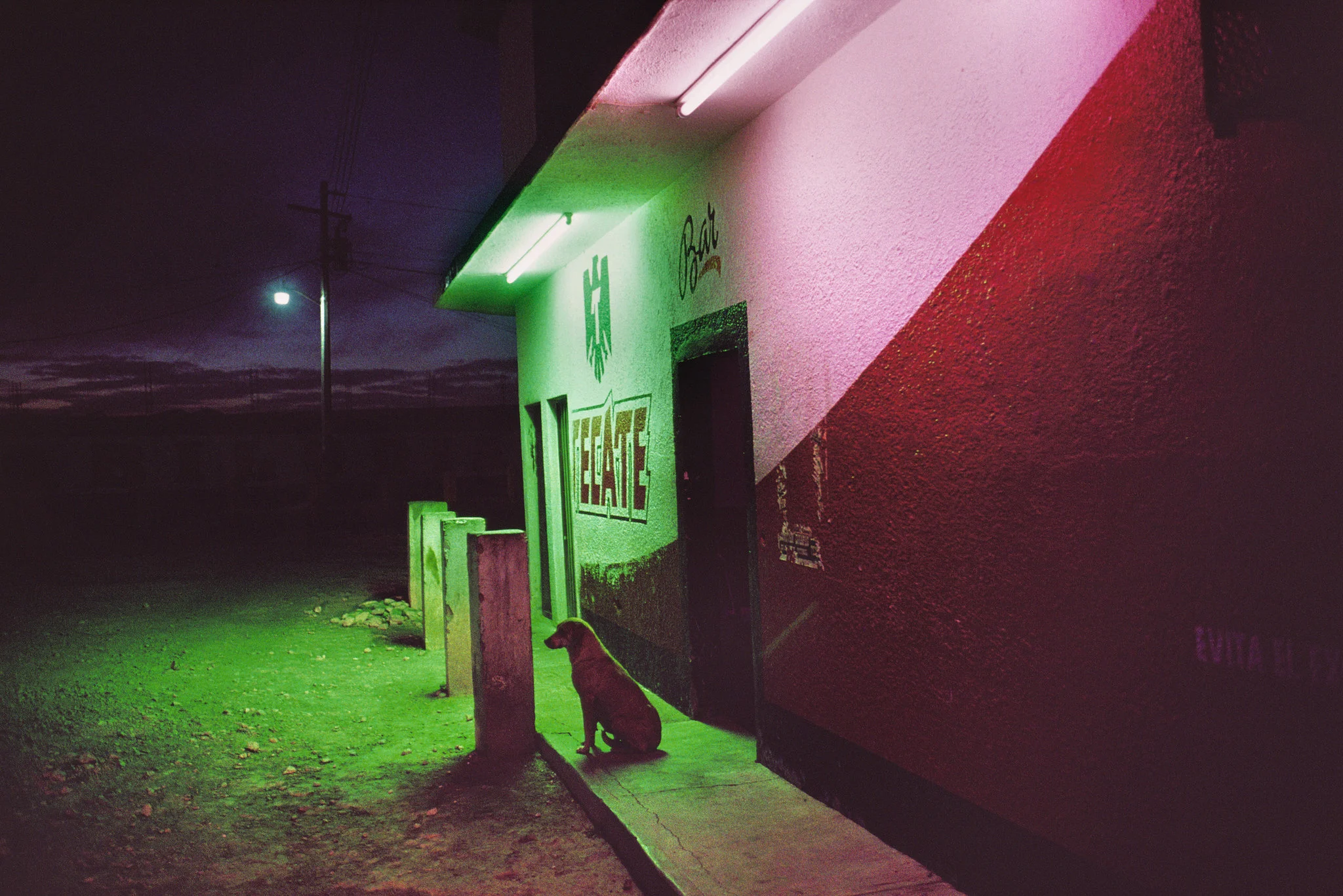 Une première image, prise de nuit à Comitán au Mexique, nous accueille. Une demi-ellipse rouge cerise court le long de la façade rugueuse du bâtiment et guide le regard vers le chien imperturbable qui monte la garde. Son profil est rétro-éclairé par un néon vert qui illumine un sol caillouteux. Au loin, un lampadaire brille dans l'obscurité et redessine le paysage. On ne sait si le soleil vient de se coucher ou s'il est sur le point de se lever et les tubes fluorescents rendent la photo froide et mystérieuse... On imagine le son de l'obturateur de l'appareil d'Alex Webb quand, au détour d'une ruelle, il est "tombé" sur cette scène qu'il captura pour le plaisir de nos yeux. "La magie de la rue c'est le mélange d'errance et d'épiphanie," observe l'écrivaine américaine Rebecca Solnit dans son essai Wanderlust: A History of Walking (2000).
