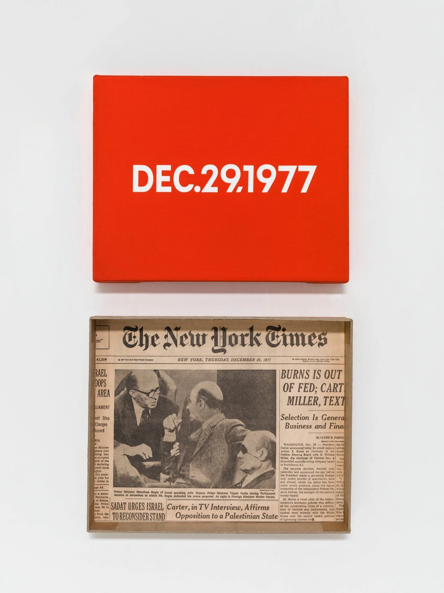 Et si la banalité du quotidien se teintait de mélancolie... Crée il y a tout juste 38 ans, ce tableau, comme tous ceux qui font partie de la série, matérialise le passage du temps. On Kawara peint la première de ses Date Paintings le 4 janvier 1966: un monochrome au centre duquel il inscrit, en blanc et au format du pays où il se trouve, la date de réalisation de la toile... Achevés en 24 heures sous peine d’être détruits, les tableaux (près de 3000) sont ensuite conservés, avec une coupure de presse du jour et du lieu de leur création, dans une boîte en carton fabriquée sur mesure. D’une œuvre à l’autre, on suit ainsi l’itinéraire du peintre.