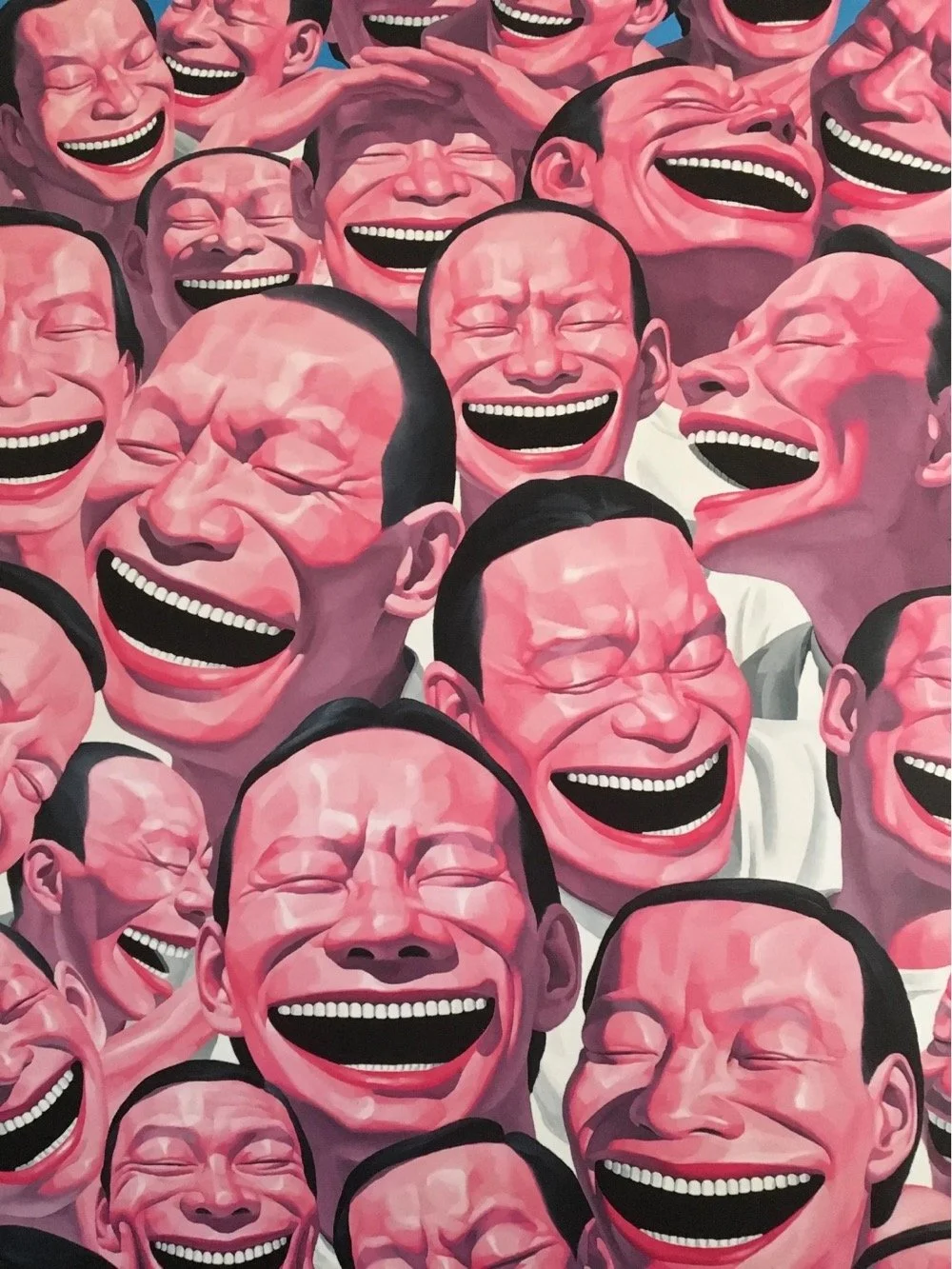Le rire est le leitmotiv du peintre chinois Yue Minjun (1962-). Les liens entre comédie et tragédie et entre sphère privée et collective le fascinent. Il décline, parfois à répétition au sein d’un seul et même tableau, son auto-portrait dont il exagère les traits. Riant aux éclats, son visage qu’il fige régulièrement dans un sourire exagéré voire crispé, frôle le grotesque ou la caricature et traduit une certaine angoisse pour ne pas dire une angoisse certaine. La mise en scène de sa propre image dans des scénarios insolites lui permet de véhiculer en filigrane un regard acerbe sur les transformations de la société chinoise. Pour le citer: « Le fait de sourire, de rire pour cacher son impuissance a [une grande] importance pour ma génération. »