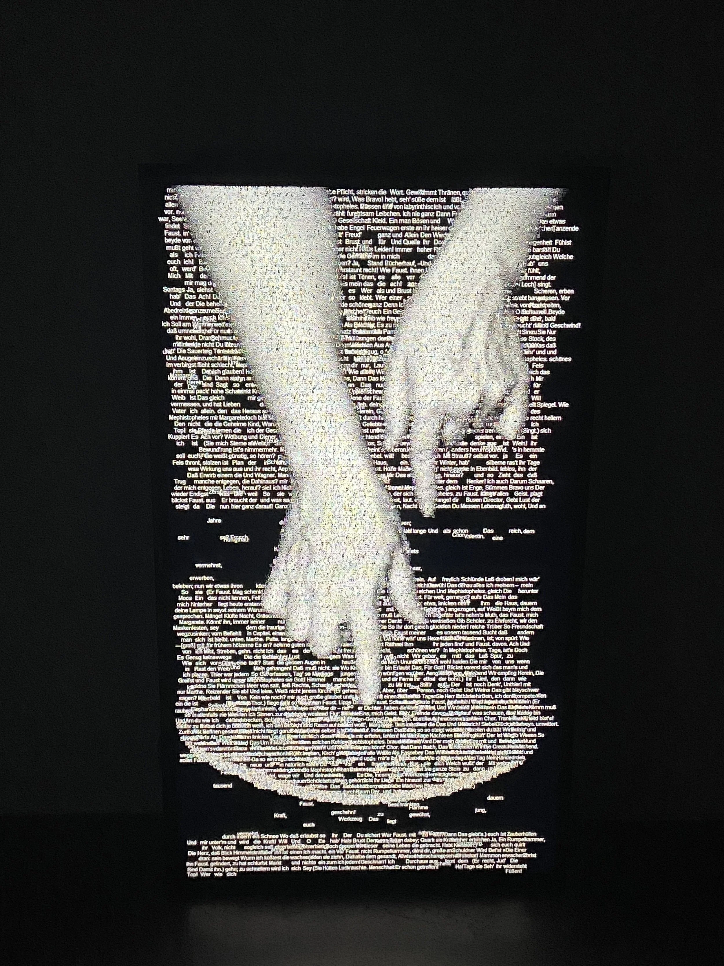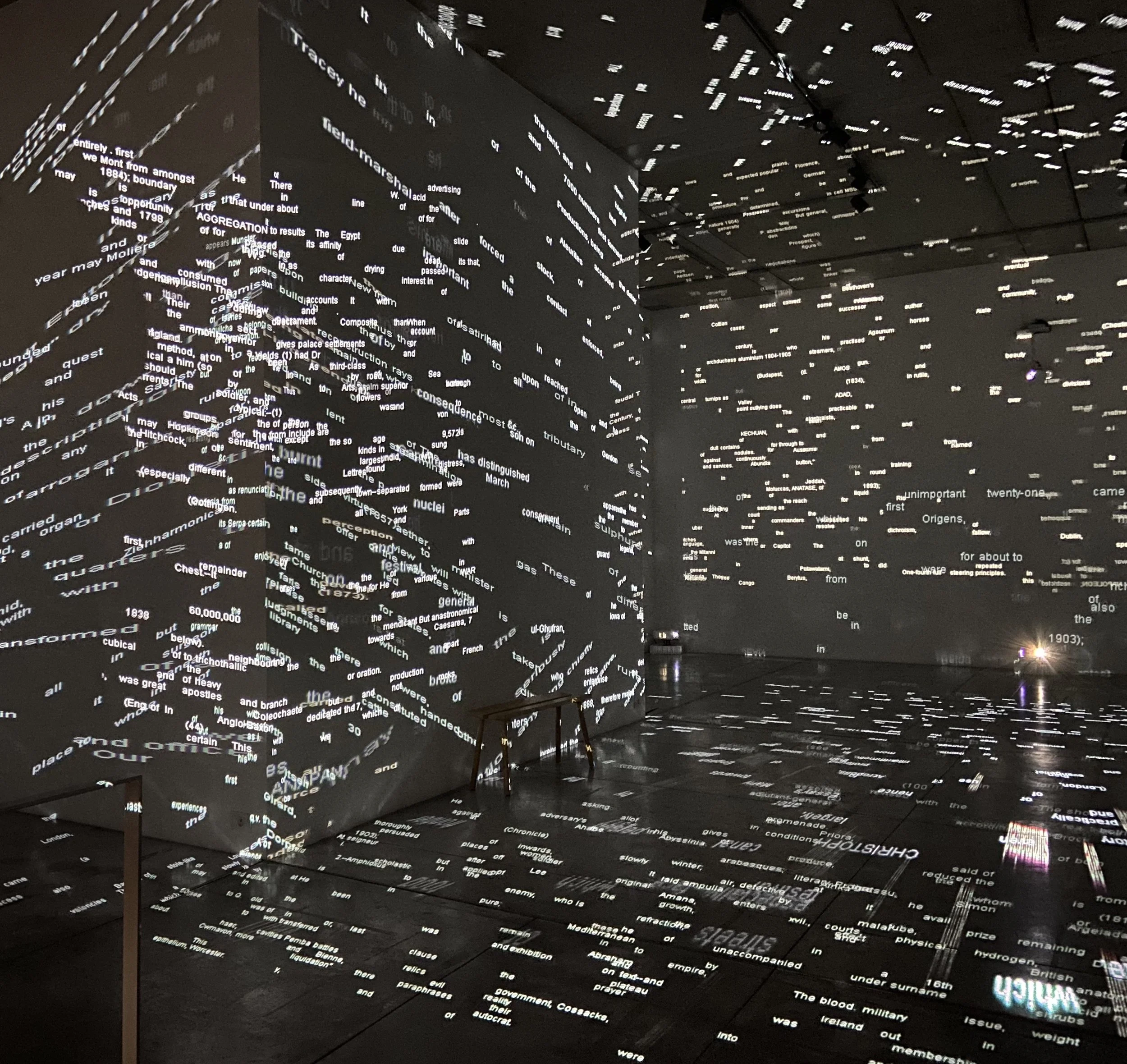 Artiste écossais basé en Finlande, Charles Sandison (1969-) fait dialoguer art et code informatique dans sa pratique située à la croisée de la video, de l’installation immersive et de l’art numérique. Plongé dans la pénombre, l’espace est illuminé par une nuée de mots, des serpentins typographiques qui se promènent, envahissent et se répandent progressivement sur les murs, du sol au plafond. Les lettres épellent des termes issus de l’édition de 1911 de l’Encyclopædia Britannica. Ils virevoltent, s’entremêlent et s’entre-croisent, apparaissent et disparaissent comme par magie, selon la logique des projections générées par algorithmes. Les accrétions de mots et les significations qu’ils évoquent enveloppent le visiteur et dessinent des formes spectrales qui tantôt fusionnent, tantôt implosent et se dispersent à la surface des parois.