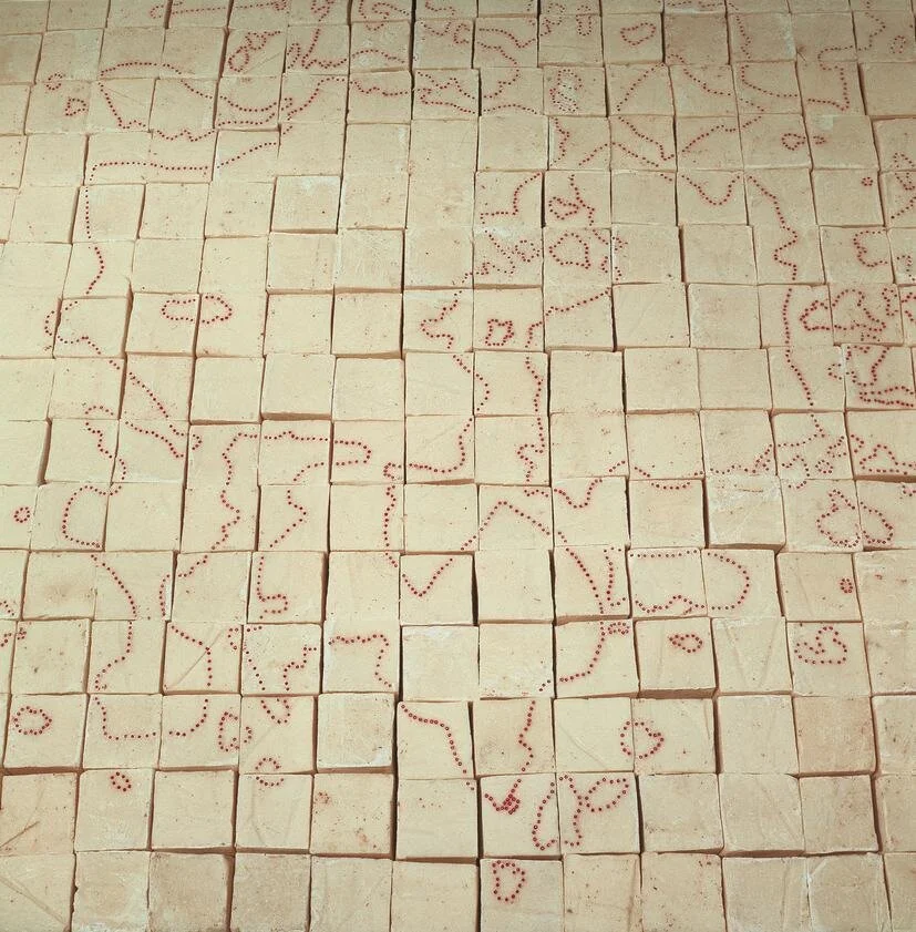 D’origine palestinienne et libanaise de naissance, la plasticienne britannique Mona Hatoum (1952-) articule sa pratique éclectique tant autour de son histoire personnelle, marquée par l'exil, la séparation et le déracinement, qu’autour de questions de société. L’instabilité géopolitique mondiale, l’errance, les conflits armés, l’enfermement, la surveillance, le féminisme sont autant de thématiques qui lui tiennent à cœur. Artiste pluridisciplinaire, elle se consacre principalement à la performance et à la vidéo au début de son parcours et s’intéresse, au fil des années, à la sculpture, à l’installation à grande échelle et aux œuvres sur papier. Elle fait feu de tout bois et utilise des matériaux industriels (fils de fer barbelés et grilles en métal, ressorts de matelas, brique, béton,bronze, verre), des objets du quotidien (ustensiles de cuisine, tapis, lits d’enfants) mais aussi ses propres cheveux et ses rognures d’ongles. Sa démarche est conceptuelle et l’esthétique de ses œuvres est minimaliste voire parfois surréaliste. « Le premier abord avec une œuvre d’art est d’ordre physique. J’aime que mon travail agisse à la fois sur les sens et sur l’intellect. Les significations, connotations et associations viennent après ce contact physique. C’est alors que fusent les idées et l’imagination » explique-t-elle.