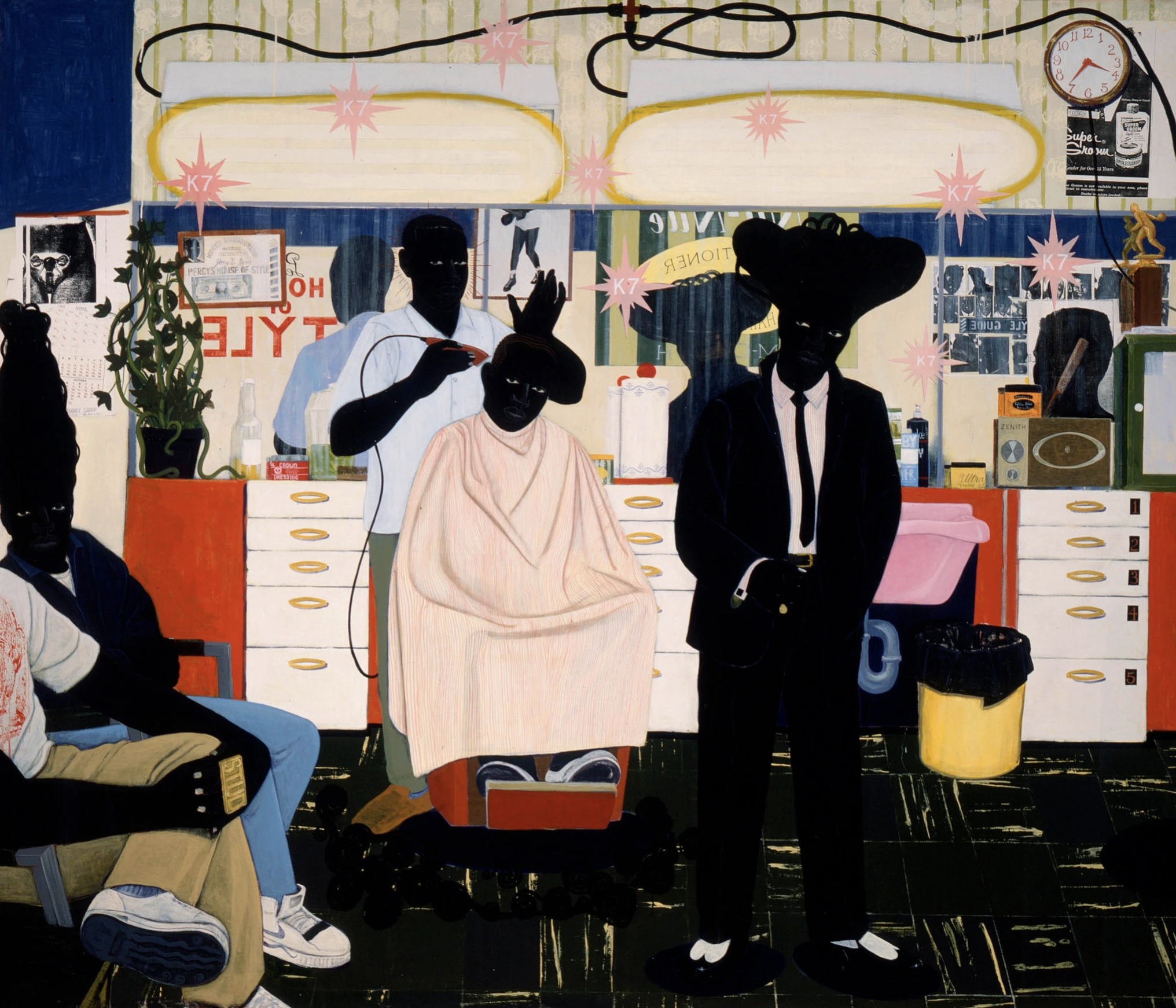Artiste phare de sa génération, l’américain Kerry James Marshall (1955-) interroge la représentation des noirs dans l’histoire de l’art et n’a de cesse, pour citer librement l’écrivain Ralph Ellison, de mettre en scène celles et ceux que l’on côtoie mais que l’on “ne voit pas”. Sa pratique protéiforme s’articule autour de peintures monumentales, de dessins, de bandes-dessinées et de sculptures. En accentuant l'ébène de la couleur de peau de ses personnages, il souligne la tension entre visibilité et invisibilité, entre absence et présence.