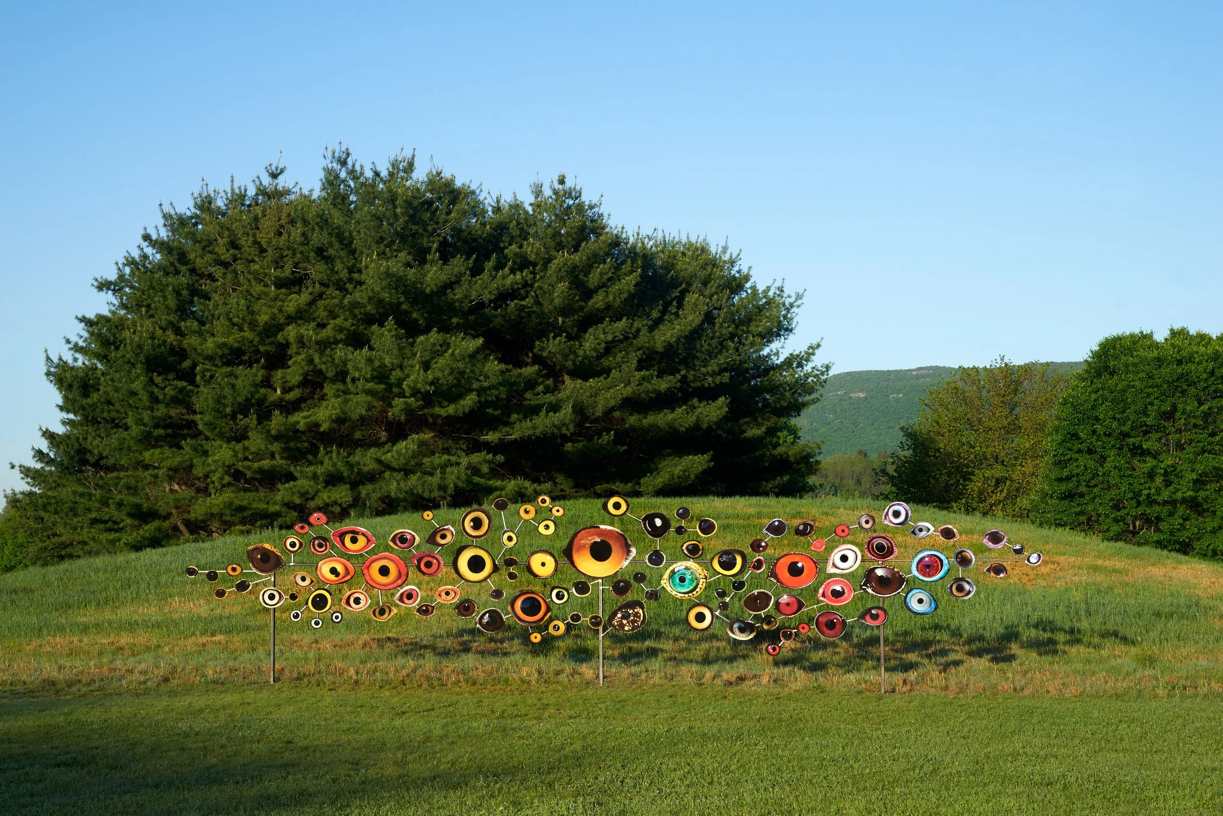 Le changement climatique est au coeur des préoccupations de l’artiste américaine Jenny Kendler (1980-). Dans ses oeuvres pluridisciplinaires, elle s’attèle à attirer notre attention sur l’impact du dérèglement du climat sur le monde vivant. Dans son installation intitulée Birds Watching (2018), les yeux de 100 espèces d’oiseaux menacés d’extinction harponnent notre regard. Créée en collaboration avec une équipe de scientifiques, cette sculpture monumentale dessine un portrait d’une biodiversité qui pourrait bien ne plus exister dans les années à venir. Selon l’artiste: « L'art est une forme d’enchantement, et de ce fait, c’est le contraire du désespoir. L'art permet (…) d’envisager d'autres mondes possibles. »