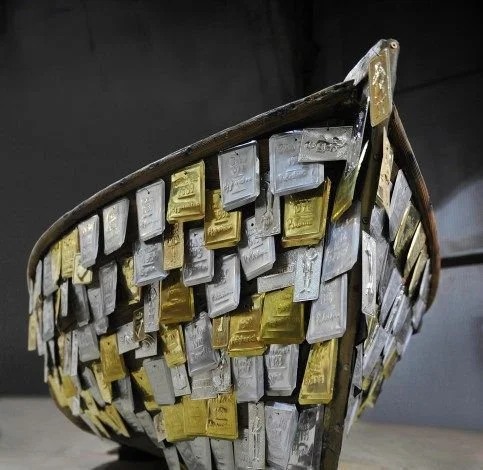 Kalliopi Lemos, Pledges for a Safe Passage, wooden boat covered with original votives and votives from tin obtained from soft drink cans carrying the names of illegal immigrants, various dimensions, 2012. 3rd International Biennial of Canakkale, Canakkale. Image courtesy the artist