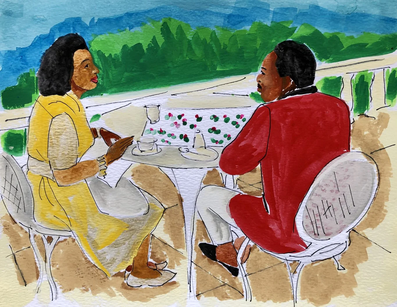 Derrick Adams, "MLK's Tropic Interlude (Martin and Coretta)," 2021, mixed media on paper.