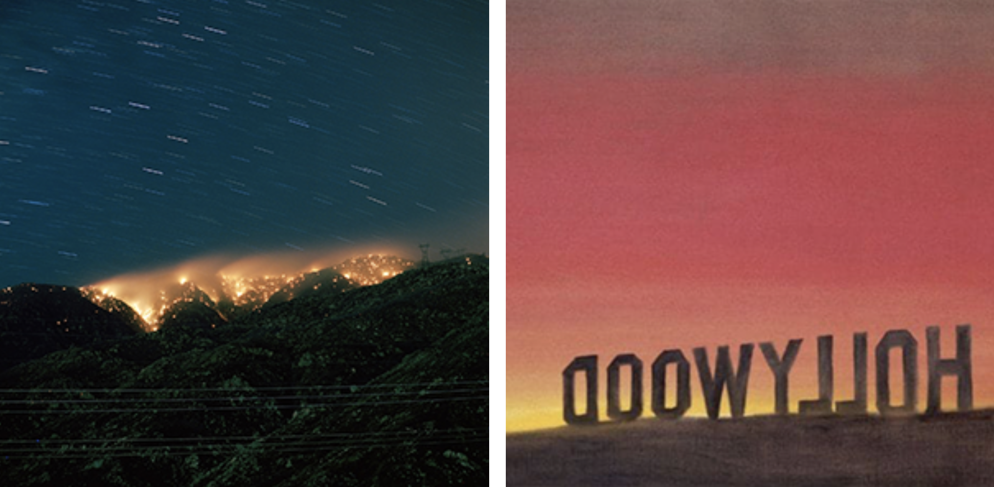 Depuis le début des années 60, l’artiste américain Ed Ruscha (1937-) développe une pratique à la croisée de l’art conceptuel et du Pop Art. La banalité du quotidien, les panneaux publicitaires et la signalétique qui meublent l’espace urbain californien l’inspirent. Très graphiques, ses peintures, dessins et photographies s’appuient sur la tension sémantique qui se dégage de l’association de mots et d’images. Onomatopées, calembours et allitérations traversent ses tableaux à la facture lisse et dénuée d’effets de matière. L’artiste à l’humour caustique cultive un style “neutre” à la lisière du documentaire et n’a de cesse de jouer avec les échelles et les perspectives, de jongler avec les registres et d’expérimenter les formats. « Les mots ont une température » déclare-t-il « quand ils atteignent un certain degré et deviennent brûlants, ils m’attirent… »