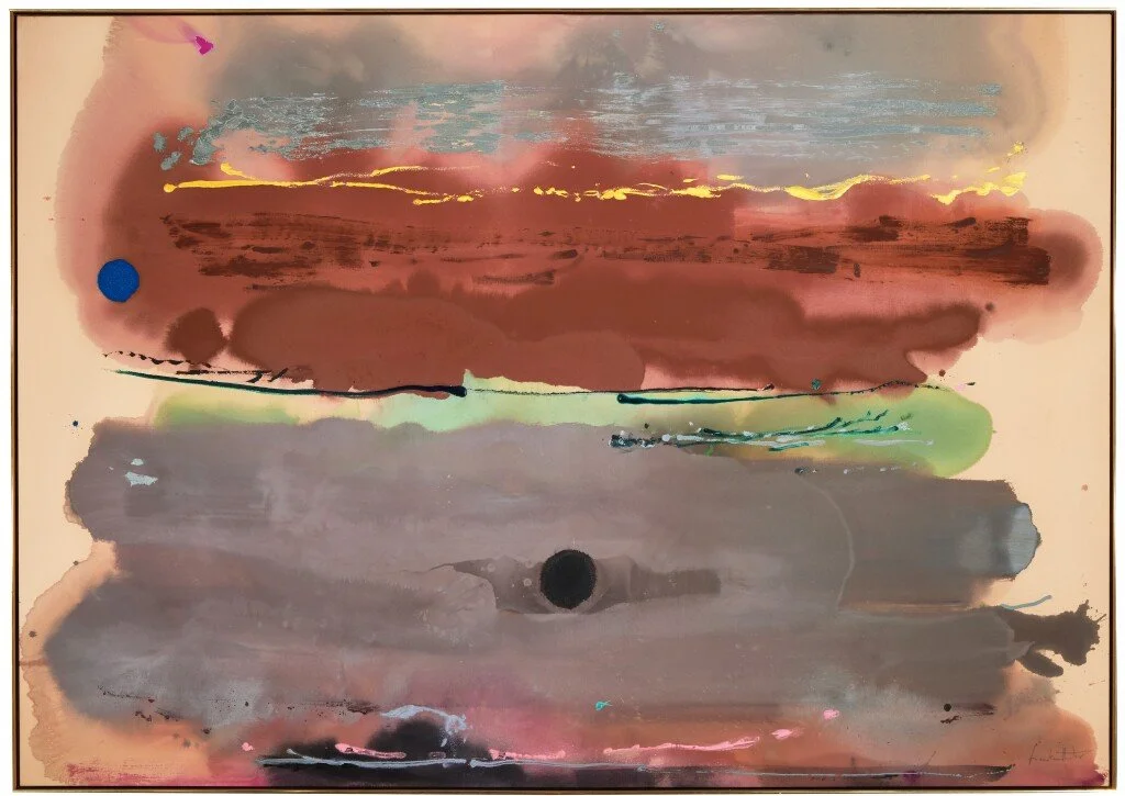 Figure majeure de l’expressionnisme abstrait, l’américaine Helen Frankenthaler (1928-2011) s’inscrit dans la mouvance du Color Field Painting, un mouvement pictural né à New York qui se caractérise par des tableaux abstraits de grandes dimensions tout en aplats de couleurs. Elle met au point la technique du stained color, technique qui utilise la peinture comme une teinture qui imprègne directement la toile. La tache qui en résulte semble auréolée ce qui donne à l’oeuvre une illusion de mouvement continu. Artiste prolifique, elle n’a eu de cesse de se renouveler au cours des six décennies de sa carrière. Elle écrivait d’ailleurs qu’“il n’y a pas de règles. C’est ainsi que nait l’art et que des percées se font. Aller contre les règles ou les ignorer. Voilà la base inaliénable de toute création.”