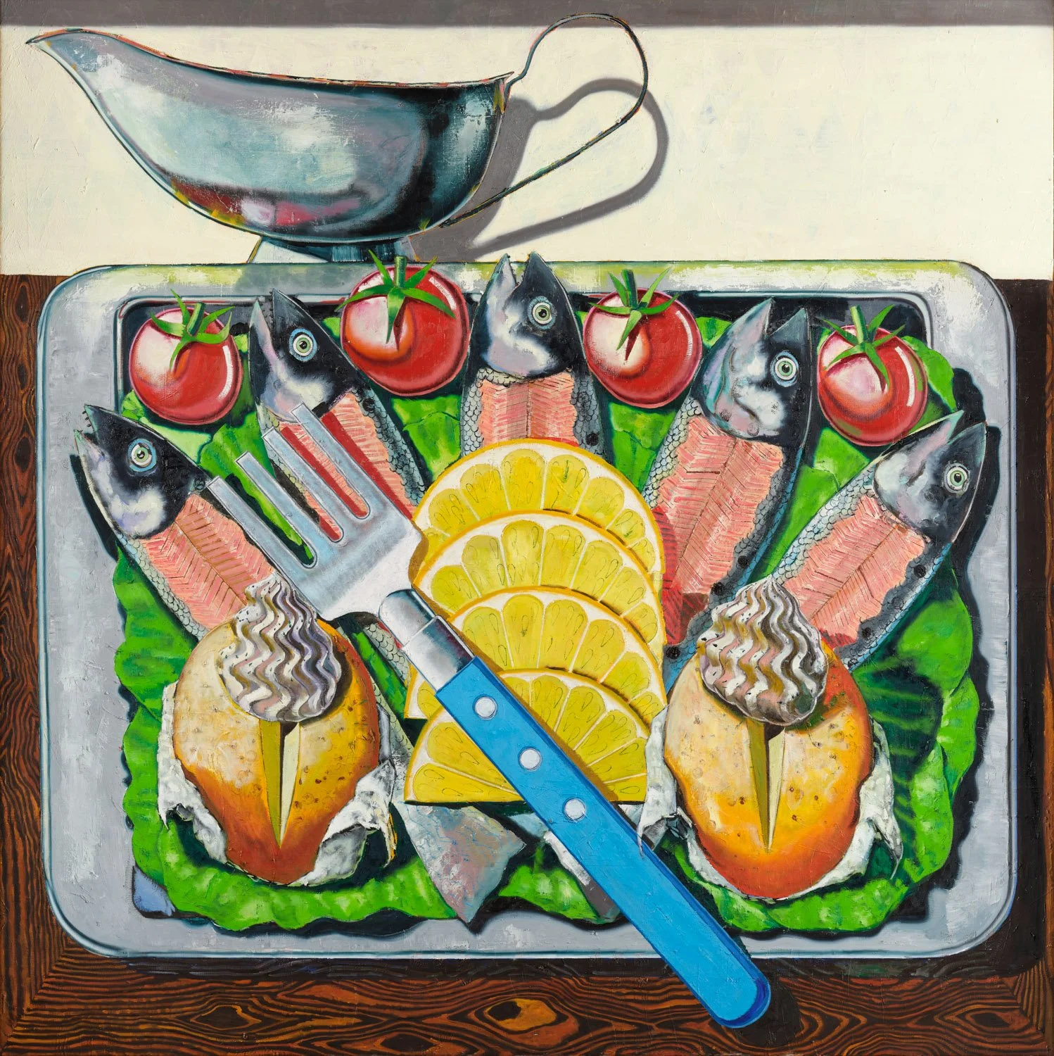 Universelle s’il en est, la thématique de l’alimentation irrigue bon nombre d’oeuvres de Kristof Santy (1987-). Sans volonté narrative particulière, l’artiste belge observe son environnement et dépeint, dans ses compositions à la fois graphiques et stylisées, une myriade d’objets du quotidien qui, sous l’impulsion de ses touches de pinceau, transcendent le banal. Motifs et couleurs s’entrechoquent dans ses tableaux de grand format émaillés de références folkloriques. Scènes d’intérieur et paysages figurent aussi parmi ses leitmotivs.