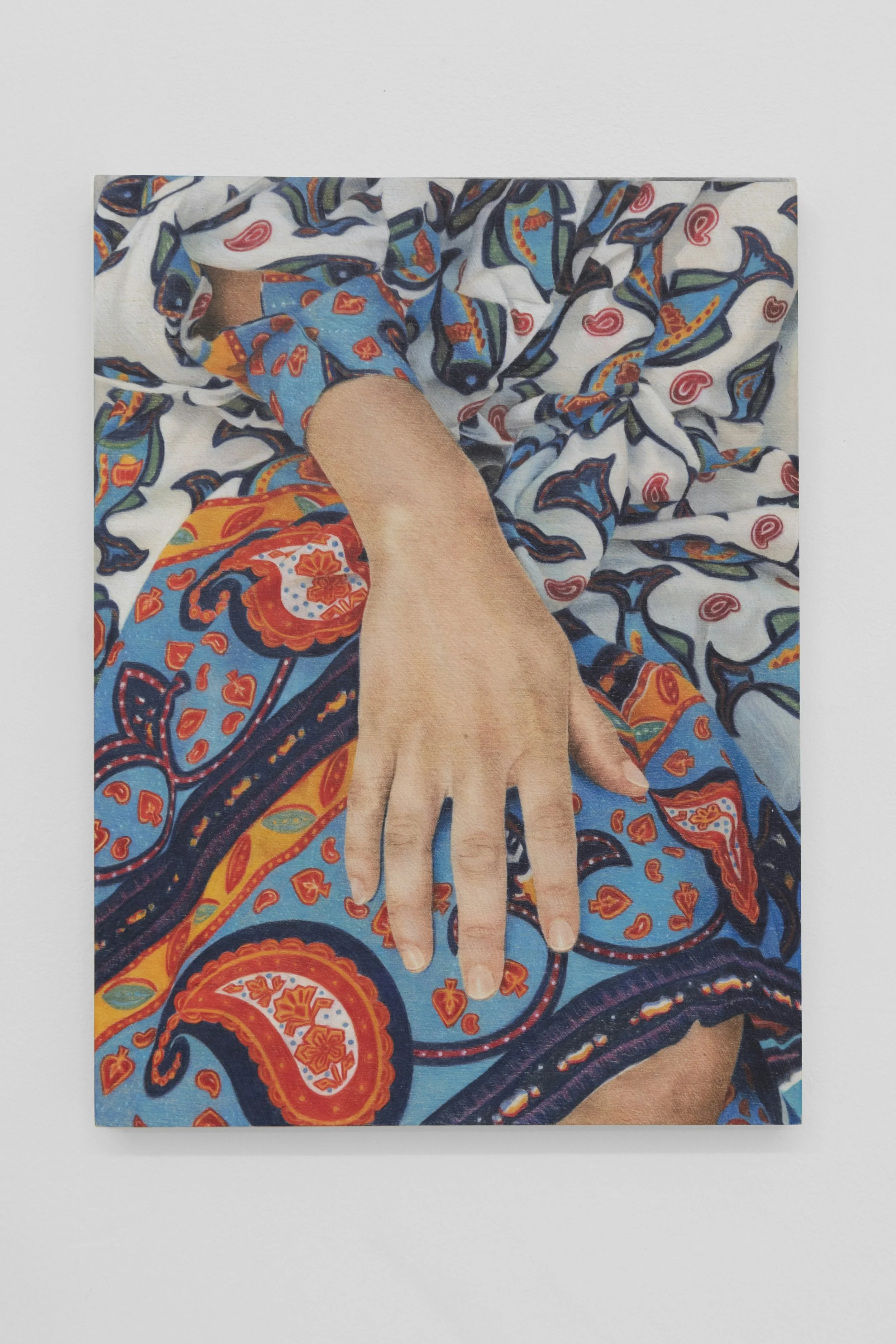 Dans ses dessins, l’artiste française Solène Rigou (1996-) ressert sa focale sur les mains. Inspirées par les êtres qu’elle chérit et les moments de grâce qu’elle photographie, ses compositions hyperréalistes de petit format sont minutieusement réalisées au crayon de couleur sur des panneaux en bois. Ses oeuvres attisent la curiosité dans la mesure où, en ne révélant pas le visage de ses sujets, notre regard se rattache à la gestuelle et au positionnement des mains mais aussi aux accessoires qui les ornent, aux objets qu’elles tiennent et aux étoffes et vêtements qui les entourent et qui pourraient nous renseigner sur les personnes représentées. « Dessiner les mains c’est dépeindre profondément l’humain. »