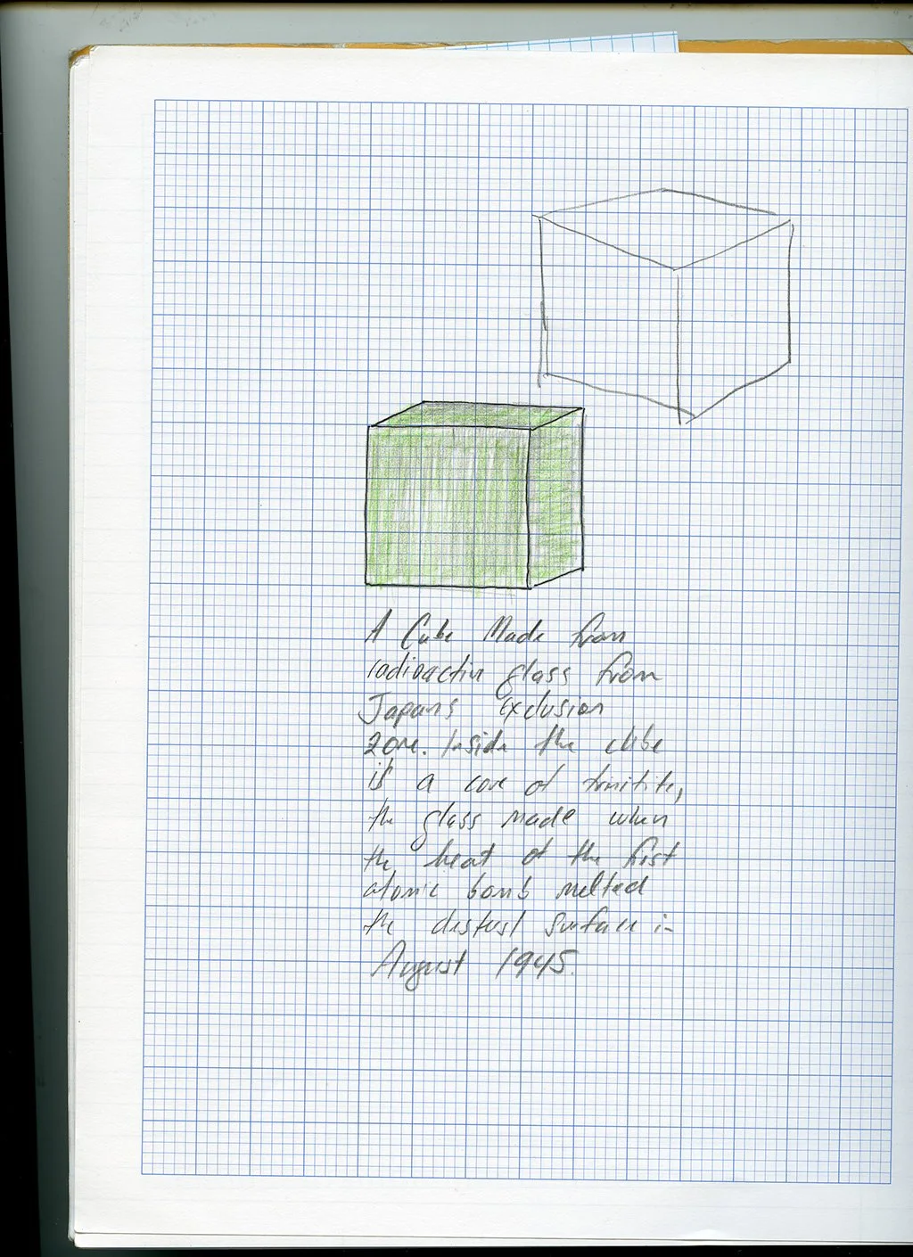 Trevor Paglen, Trinity Cube, 2015 Irritated glass from Fukushima Exclusion Zone, Trinitite 7 ⅞ × 7 ⅞ × 7 ⅞ in. Installation view, Fukushima, Japan, 2015 – ongoing