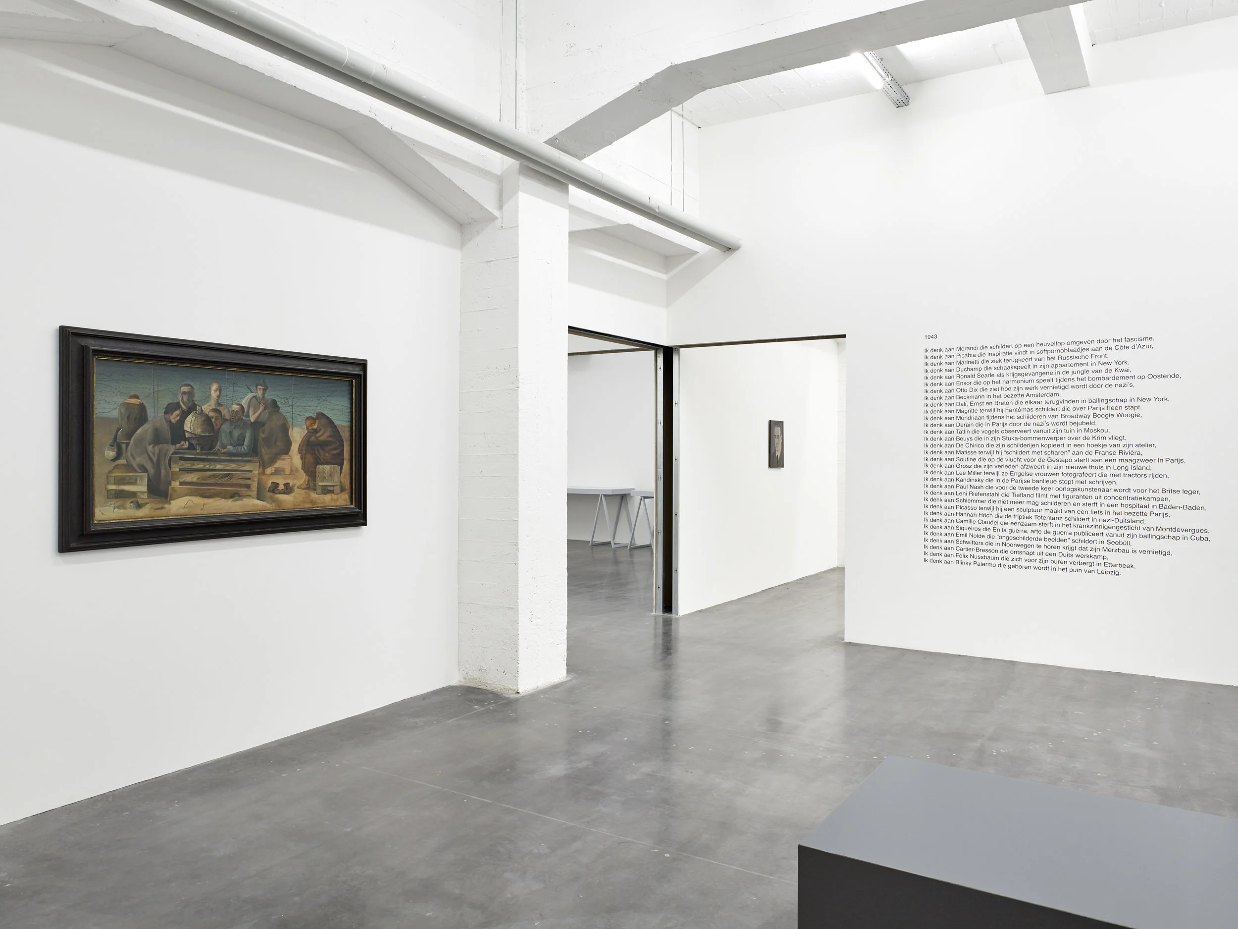 Dans une autre salle, 1943 (2017), l'œuvre de Francis Alÿs questionne, sous forme de poème en prose, la position éthique de l'artiste. La trentaine d'artistes autour desquels s'articule le poème nous invite à méditer sur comment chacun d'eux a fait ou non acte de résistance au cours de l'année 1943 et sur les liens subtils entre création artistique et liberté d'expression en temps de guerre. Cette œuvre murale dialogue efficacement avec les tableaux du peintre juif allemand Felix Nussbaum (1904-1944) qu'elle côtoie. En 1943, comme on peut le lire dans le poème de Francis Alÿs, Felix Nussbaum "se cachait de ses voisins à Etterbeek" à Bruxelles (il sera dénoncé un an plus tard et déporté à Auschwitz où il fût exterminé…) et, contrairement à certains autres artistes cités, ses œuvres documentaient et dénonçaient l’inacceptable (il avait d’ailleurs insisté auprès de la personne à qui il confia ses toiles pour la postérité: “si je péris, ne laisse pas mourir mes tableaux. Montre-les aux gens !”). Ses peintures ont de ce fait une valeur de témoignage indéniable.