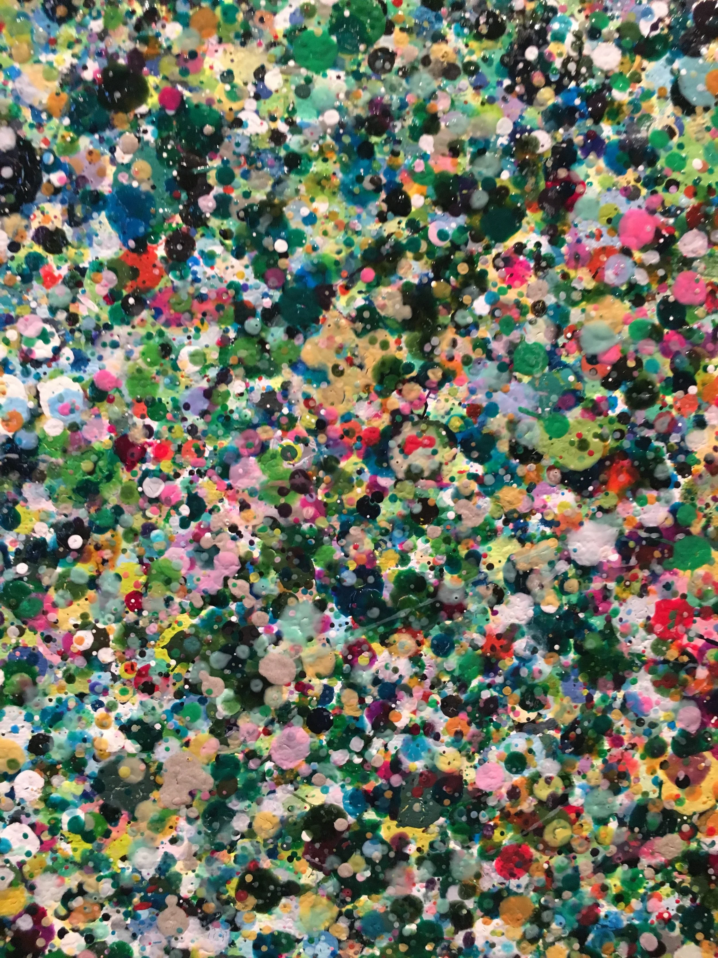 Autre sensation dans la bibliothèque où deux gigantesques tableaux se font face et se "promènent" en déployant leur "verdoyance" exubérante et multicolore... Face à ses toiles frontales, on ne peut s'empêcher de s'interroger sur le comment de leur réalisation et d'imaginer le mouvement du pinceau de l'artiste qui déposerait à l'infini ses pointillés par un mouvement de va-et-vient presque viscéral.