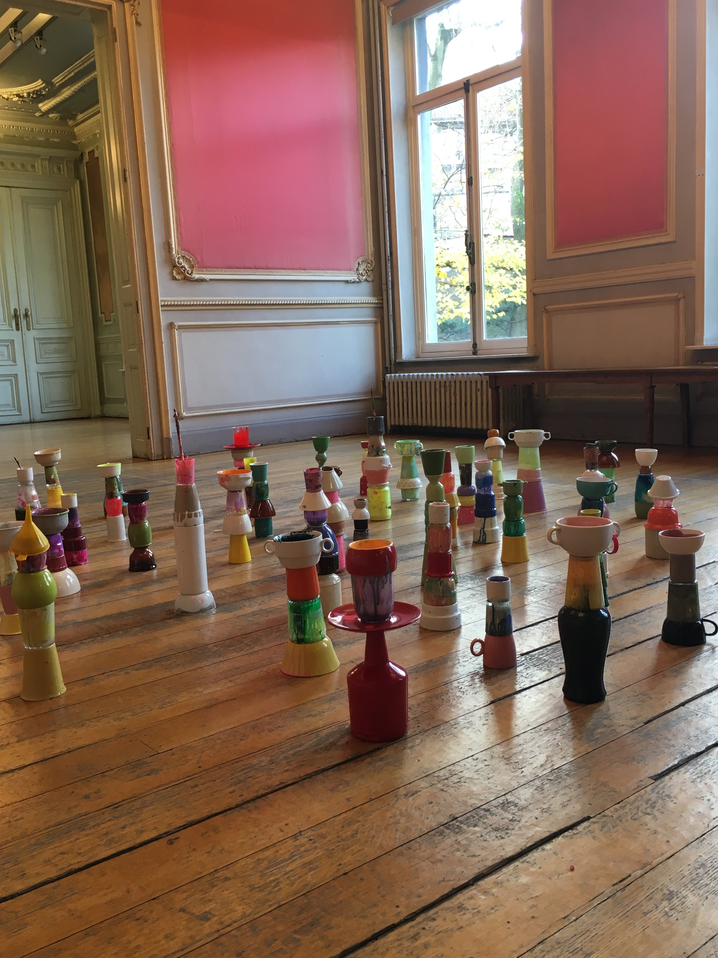 Dans trois des cinq salles de l'exposition, on découvre des portraits de personnalités locales réinterprétés mais aussi des coulées de peinture (Colors Escaped) et les Pot(e)s d'ateliers de l'artiste, des travaux en trois dimensions exposés dans la salle à manger (dite "salle Renaissance") et dans le grand salon. Par le biais des coulées, Léopoldine Roux donne littéralement corps à la peinture. Leur installation dans la salle Renaissance est particulièrement réussie dans la mesure où leurs couleurs pop se démarquent à merveille des lambris sombres et surchargés qui ornent les murs de la pièce. Avec la série Colors Escaped, l'outil de création devient le sujet, une sculpture de peinture qui "coule", un instant qui fige à jamais dans l'espace l'écoulement du temps et de la matière.