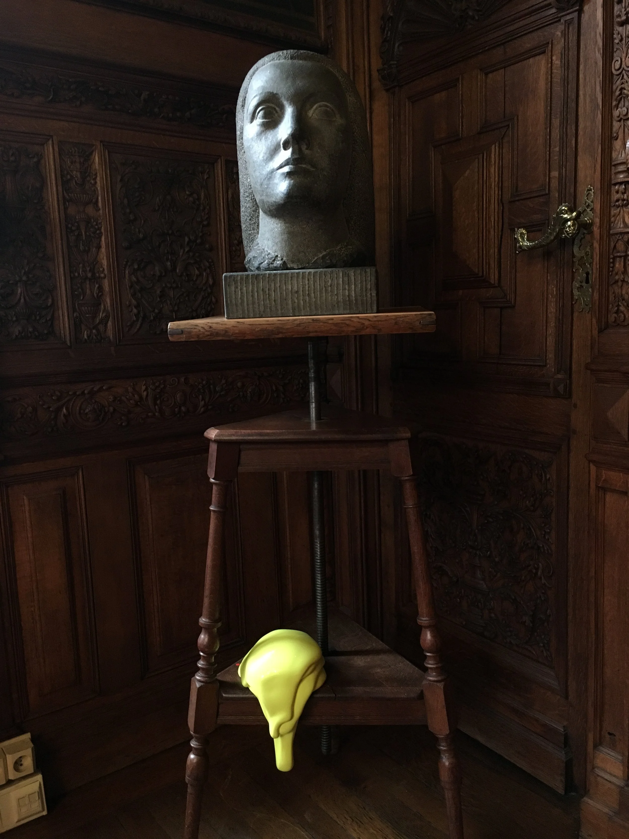 A titre d'exemple, la sculpture argentée de l'artiste français Didier Marcel tend la main à l'arbre dessiné à l'aquarelle par le plasticien japonais Tadashi Kawamata dans la maquette de ses Tree Huts (cabanes en bois installées à Bruges dans le Jardin du Béguinage lors de la Triennale d'art contemporain et d'architecture de 2015) dont le tronc semble être en lévitation dans les excroissances en bois patiné reconverties en tables d'appoint par Didier Delville...