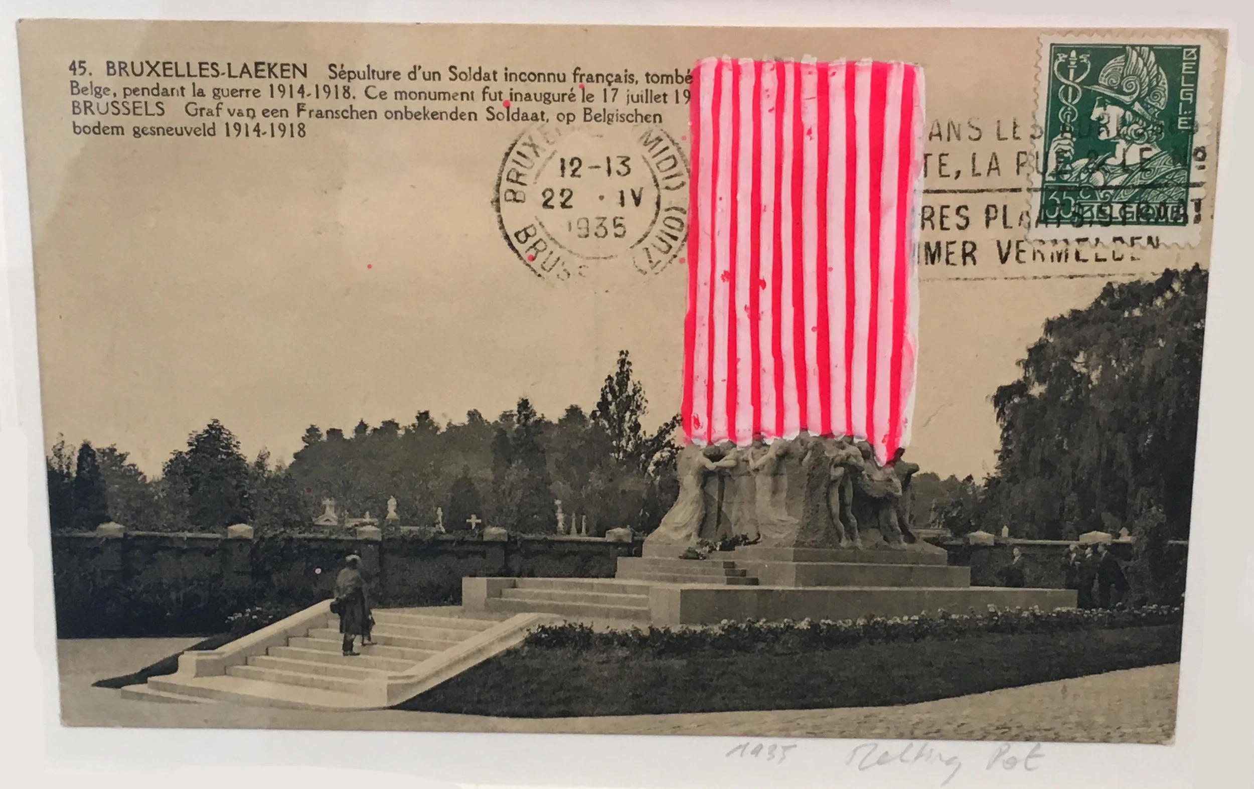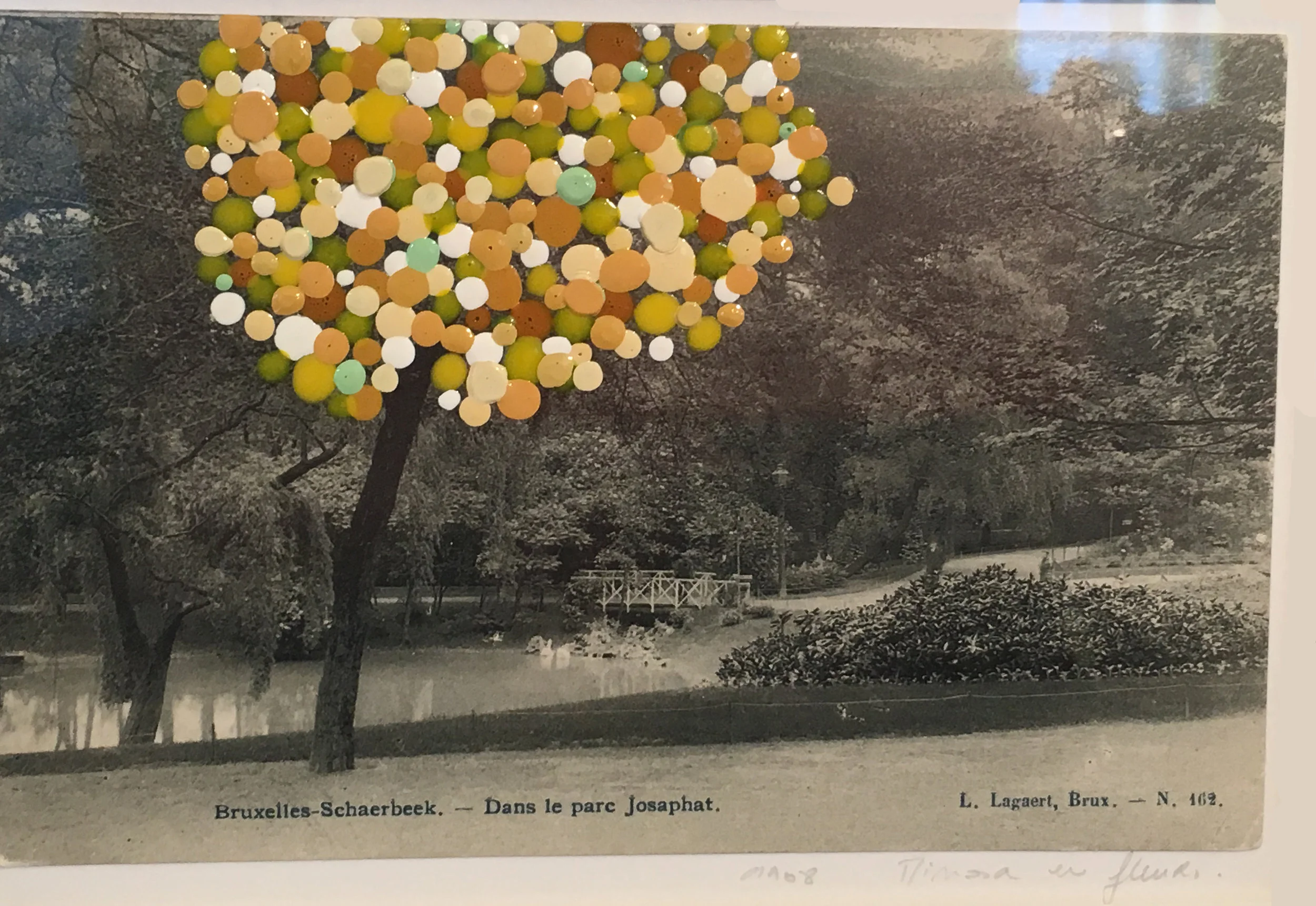 Dans le vestibule de la vaste demeure, le visiteur est accueilli par deux imposants cadres en bois que Léopoldine Roux a trouvé in situ et dans lesquels elle a installé une trentaine de cartes postales d'époque glanées sur des marchés aux puces ou issues de correspondances familiales. Elle est intervenue sur chacune d'entre elles en sublimant le noir et blanc des lieux touristiques bruxellois par des "traces" de couleur réalisées au vernis à ongles. L'intitulé de l'exposition From Brussels with love renvoie au recto des cartes, rappelant ainsi leur fonction première et les messages qu'elles recèlent. La variation des interventions de l'artiste est étonnante: un camaïeu de jaune enjolive un arbre du Parc Josaphat tandis qu'une colonne lignée rose et blanc recouvre partiellement le monument au soldat inconnu et que le Palais de Justice se décline façon "pièce montée" couleur pastel...